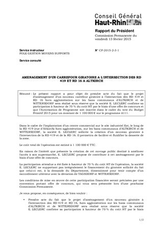 Le présent rapport a pour objet de prendre acte du fait que le projet d’aménagement d’un nouveau carrefour giratoire à l’intersection des RD 419 et RD 16 hors agglomération sur les bans communaux d’ALTKIRCH et de WITTERSDORF sera réalisé sous réserve que la société E. LECLERC confirme sa participation à hauteur de 70 % du coût HT par le biais d’une offre de concours et que l’Autorisation de Programme soit inscrite dans le cadre du vote du Budget Primitif 2015 pour un montant de 1 100 000 € sur le programme A111.