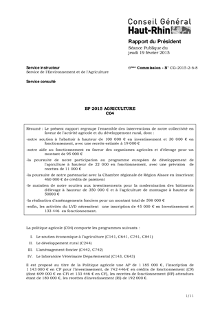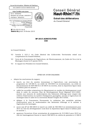 Le présent rapport regroupe l'ensemble des interventions de notre collectivité en faveur de l'activité agricole et du développement rural, dont : -notre soutien à l'abattoir à hauteur de 100 000 € en investissement et 30 000 € en fonctionnement, avec une recette estimée à 19 000 € -notre aide au fonctionnement en faveur des organismes agricoles et d'élevage pour un montant de 95 000 € -la poursuite de notre participation au programme européen de développement de l'apiculture à hauteur de 22 000 en fonctionnement, avec une prévision de recettes de 11 000 € -la poursuite de notre partenariat avec la Chambre régionale de Région Alsace en inscrivant 460 000 € de crédits de paiement -le maintien de notre soutien aux investissements pour la modernisation des bâtiments d'élevage à hauteur de 350 000 € et à l'agriculture de montagne à hauteur de 50000 € -la réalisation d'aménagements fonciers pour un montant total de 598 000 € -enfin, les activités du LVD nécessitent une inscription de 45 000 € en Investissement et 133 446 en fonctionnement.