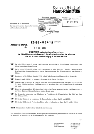 portant autorisation d'ouverture de l'établissement d'accueil d'enfants de moins de six ans sis au 1 rue Charles Péguy à Bartenheim Resumé Pièces jointes ARRETE Assemblée : Non défini Date : 31/07/2006 Rapporteur : Non défini Collectivité : Conseil départemental du Haut-Rhin Direction : Non défini Service : Service de Protection Maternelle et Infantile Domaine : Accueil d'enfants Commission :