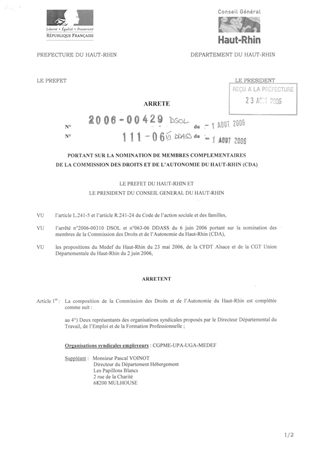 portant sur la nomination de membres complémentaires de la Commission des Droits et de l'autonomie du Haut-Rhin Resumé Pièces jointes ARRETE Assemblée : Non défini Date : 01/08/2006 Rapporteur : Non défini Collectivité : Conseil départemental du Haut-Rhin Direction : Non défini Service : Direction de la Solidarité Domaine : Autres (non classés) Commission :