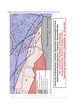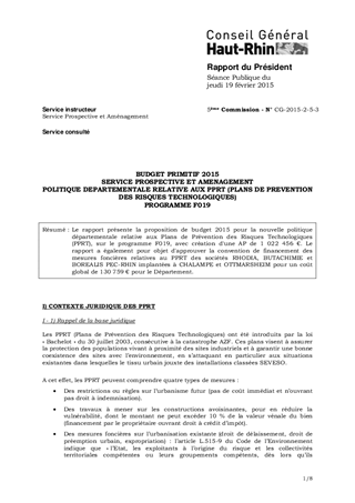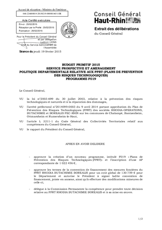 Le rapport présente la proposition de budget 2015 pour la nouvelle politique départementale relative aux Plans de Prévention des Risques Technologiques (PPRT), sur le programme F019, avec création d'une AP de 1 022 456 €. Le rapport a également pour objet d'approuver la convention de financement des mesures foncières relatives au PPRT des sociétés RHODIA, BUTACHIMIE et BOREALIS PEC-RHIN implantées à CHALAMPE et OTTMARSHEIM pour un coût global de 130 759 € pour le Département.