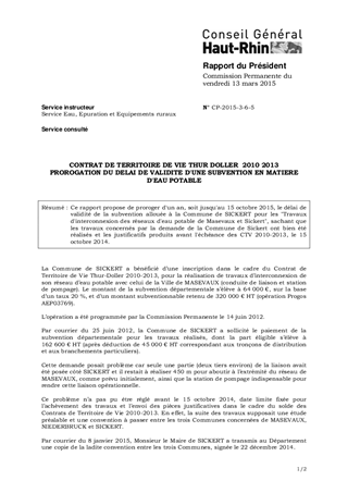 Ce rapport propose de proroger d'un an, soit jusqu'au 15 octobre 2015, le délai de validité de la subvention allouée à la Commune de SICKERT pour les "Travaux d'interconnexion des réseaux d'eau potable de Masevaux et Sickert", sachant que les travaux concernés par la demande de la Commune de Sickert ont bien été réalisés et les justificatifs produits avant l'échéance des CTV 2010-2013, le 15 octobre 2014.