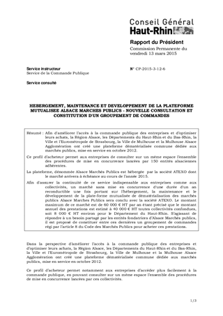 Afin d'améliorer l’accès à la commande publique des entreprises et d’optimiser leurs achats, la Région Alsace, les Départements du Haut-Rhin et du Bas-Rhin, la Ville et l’Eurométropole de Strasbourg, la Ville de Mulhouse et la Mulhouse Alsace Agglomération ont créé une plateforme dématérialisée commune dédiée aux marchés publics, mise en service en octobre 2012. Ce profil d’acheteur permet aux entreprises de consulter sur un même espace l’ensemble des procédures de mise en concurrence lancées par 150 entités alsaciennes adhérentes. La plateforme, dénommée Alsace Marchés Publics est hébergée par la société ATEXO dont le marché arrivera à échéance au cours de l’année 2015. Afin d'assurer la continuité de ce service indispensable aux entreprises comme aux collectivités, un marché sans mise en concurrence d'une durée d'un an reconductible une fois portant sur l’hébergement, la maintenance et le développement de la plate-forme mutualisée de dématérialisation des marchés publics Alsace Marches Publics sera conclu avec la société ATEXO. Le montant maximum de ce marché est de 60 000 € HT par an étant précisé que le montant annuel des prestations est estimé à 40 000 € HT toutes collectivités confondues, soit 8 000 € HT environ pour le Département du Haut-Rhin. S’agissant de répondre à un besoin partagé par les entités fondatrices d’Alsace Marchés publics, il est proposé de constituer entre ces dernières un groupement de commandes régi par l’article 8 du Code des Marchés Publics pour acheter ces prestations.