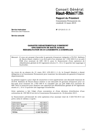 GARANTIE DEPARTEMENTALE D'EMPRUNT OPH HABITATS DE HAUTE ALSACE REHABILITATION DE 64 LOGEMENTS A GUEBWILLER