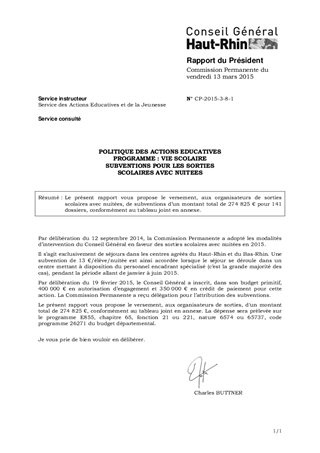 Le présent rapport vous propose le versement, aux organisateurs de sorties scolaires avec nuitées, de subventions d’un montant total de 274 825 € pour 141 dossiers, conformément au tableau joint en annexe.