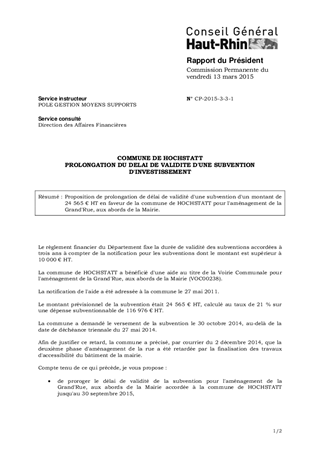 Proposition de prolongation de délai de validité d'une subvention d'un montant de 24 565 € HT en faveur de la commune de HOCHSTATT pour l'aménagement de la Grand'Rue, aux abords de la Mairie.