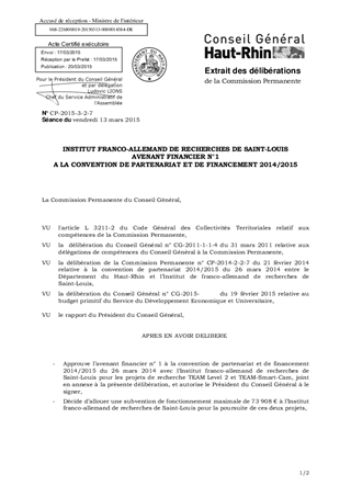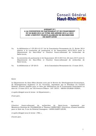 INSTITUT FRANCO-ALLEMAND DE RECHERCHES DE SAINT-LOUIS AVENANT FINANCIER N°1 A LA CONVENTION DE PARTENARIAT ET DE FINANCEMENT 2014/2015