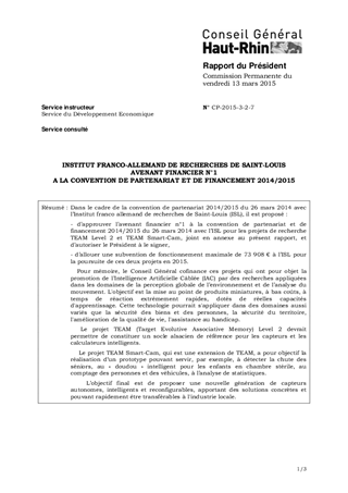 Dans le cadre de la convention de partenariat 2014/2015 du 26 mars 2014 avec l’Institut franco allemand de recherches de Saint-Louis (ISL), il est proposé : - d’approuver l’avenant financier n°1 à la convention de partenariat et de financement 2014/2015 du 26 mars 2014 avec l’ISL pour les projets de recherche TEAM Level 2 et TEAM Smart-Cam, joint en annexe au présent rapport, et d’autoriser le Président à le signer, - d’allouer une subvention de fonctionnement maximale de 73 908 € à l’ISL pour la poursuite de ces deux projets en 2015. Pour mémoire, le Conseil Général cofinance ces projets qui ont pour objet la promotion de l’Intelligence Artificielle Câblée (IAC) par des recherches appliquées dans les domaines de la perception globale de l’environnement et de l’analyse du mouvement. L'objectif est la mise au point de produits miniatures, à bas coûts, à temps de réaction extrêmement rapides, dotés de réelles capacités d'apprentissage. Cette technologie pourrait s'appliquer dans des domaines aussi variés que la sécurité des biens et des personnes, la sécurité du territoire, l'amélioration de la qualité de vie, l'assistance au handicap. Le projet TEAM (Target Evolutive Associative Memory) Level 2 devrait permettre de constituer un socle alsacien de référence pour les capteurs et les calculateurs intelligents. Le projet TEAM Smart-Cam, qui est une extension de TEAM, a pour objectif la réalisation d’un prototype pouvant servir, par exemple, à détecter la chute des séniors, au « doudou » intelligent pour les enfants en chambre stérile, au comptage des personnes et des véhicules, à l’analyse de statistiques. L’objectif final est de proposer une nouvelle génération de capteurs autonomes, intelligents et reconfigurables, apportant des solutions concrètes et pouvant rapidement être transférables à l'industrie locale.