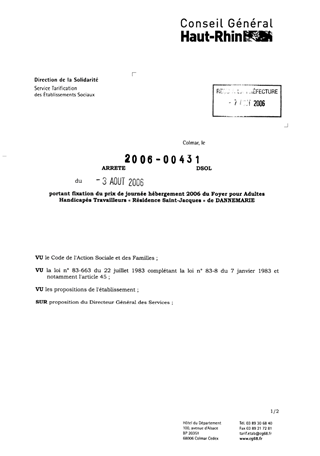 portant fixation du prix de journée hébergement 2006 du Foyer pour Adultes Handicapés Travailleurs "Résidence Saint-Jacques" de Dannemarie Resumé Pièces jointes ARRETE Assemblée : Non défini Date : 03/08/2006 Rapporteur : Non défini Collectivité : Conseil départemental du Haut-Rhin Direction : Non défini Service : Service de la Tarification des Etablissements Domaine : Prix de Journée Commission :