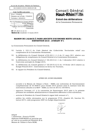 MAISON DE L'ALSACE À PARIS (SOCIETE D'ECONOMIE MIXTE LOCALE) - SUBVENTION 2015 - AVENANT N°1