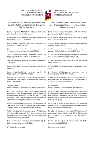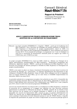 Le projet européen INTERREG IV- A baptisé « TRION », porté par la Conférence du Rhin Supérieur, vise à favoriser les échanges de bonnes pratiques à l’échelle du Rhin Supérieur et l’émergence de projets transfrontaliers. Lancé en 2009, ce projet a fait l’objet de deux programmes INTERREG IV, dont l’échéance est prévue en juin 2015. Il est proposé de prolonger ce programme sur 3 ans et d’adopter à cette fin la convention de financement triennale jointe au rapport qui s'élève à 5 000 €/an, soit 15 000 € au total.