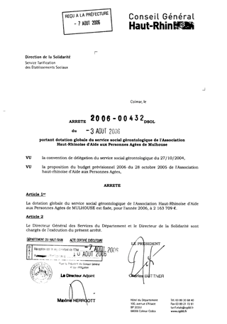 portant dotation globale du service social gérontologique de l'Association Haut-Rhinoises d'Aide aux Personnes Agées de Mulhouse Resumé Pièces jointes ARRETE Assemblée : Non défini Date : 03/08/2006 Rapporteur : Non défini Collectivité : Conseil départemental du Haut-Rhin Direction : Non défini Service : Service de la Tarification des Etablissements Domaine : Dotations financières Commission :