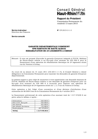 Il vous est proposé d’accorder la garantie d'emprunt intégrale à l’O.P.H. Habitats de Haute-Alsace relative à un Eco-prêt d’un montant de 420 000 € pour le financement d’une opération de réhabilitation thermique de 24 logements situés rue du Ventron à Cernay.
