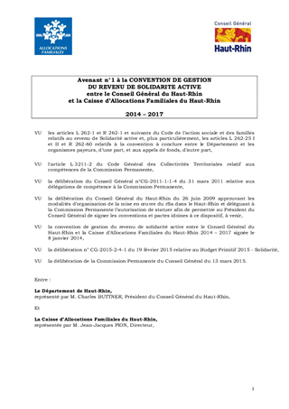 Dans la perspective de lutter plus efficacement contre la fraude au revenu de Solidarité active (rSa) et d’assurer le versement du juste droit, le Conseil Général du Haut-Rhin a demandé à la Caisse d’Allocations Familiales du Haut-Rhin (CAF) d’intensifier les contrôles sur place, au domicile des bénéficiaires du rSa. Les agents de la CAF sont habilités à effectuer ce type de démarches, de manière tout à fait légale. A cette fin, il vous est proposé de valider l’avenant n°1 à la convention de gestion du rSa 2014-2017 entre nos deux institutions, renforçant le plan de contrôle annuel de la CAF, sous réserve du vote du budget annuel. Ainsi en 2015, le renfort consistera en 285 contrôles pour un coût de 99 750 € et un démarrage en mai.