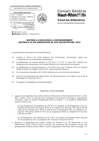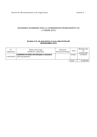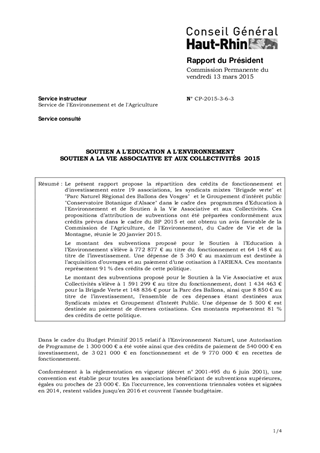 Le présent rapport propose la répartition des crédits de fonctionnement et d'investissement entre 19 associations, les syndicats mixtes "Brigade verte" et "Parc Naturel Régional des Ballons des Vosges" et le Groupement d'intérêt public "Conservatoire Botanique d'Alsace" dans le cadre des programmes d’Education à l'Environnement et de Soutien à la Vie Associative et aux Collectivités. Ces propositions d’attribution de subventions ont été préparées conformément aux crédits prévus dans le cadre du BP 2015 et ont obtenu un avis favorable de la Commission de l'Agriculture, de l'Environnement, du Cadre de Vie et de la Montagne, réunie le 20 janvier 2015. Le montant des subventions proposé pour le Soutien à l’Education à l’Environnement s’élève à 772 877 € au titre du fonctionnement et 64 148 € au titre de l’investissement. Une dépense de 5 340 € au maximum est destinée à l’acquisition d’ouvrages et au paiement d’une cotisation à l'ARIENA. Ces montants représentent 91 % des crédits de cette politique. Le montant des subventions proposé pour le Soutien à la Vie Associative et aux Collectivités s’élève à 1 591 299 € au titre du fonctionnement, dont 1 434 463 € pour la Brigade Verte et 148 836 € pour la Parc des Ballons, ainsi que 8 850 € au titre de l’investissement, l’ensemble de ces dépenses étant destinées aux Syndicats mixtes et Groupement d’Interêt Public. Une dépense de 5 500 € est destinée au paiement de diverses cotisations. Ces montants représentent 81 % des crédits de cette politique.