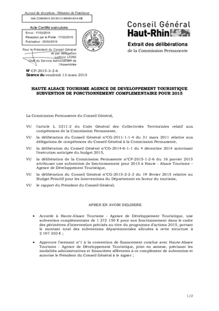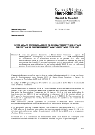 HAUTE ALSACE TOURISME AGENCE DE DEVELOPPEMENT TOURISTIQUE SUBVENTION DE FONCTIONNEMENT COMPLEMENTAIRE POUR 2015