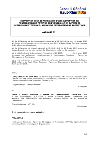 Il vous est proposé d’accorder à Haute-Alsace Tourisme - Agence de Développement Touristique (ADT), une subvention de 1 272 150 €, correspondant au complément de la subvention allouée le 16 janvier 2015 pour son fonctionnement dans le cadre des périmètres d’intervention précisés au titre du programme d’actions 2015, portant le montant total de subvention à 2 197 350 €, conformément aux crédits inscrits au budget primitif 2015. Il vous est également proposé de conclure un avenant à la convention de financement.