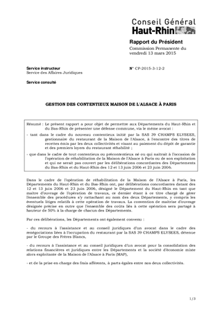 Le présent rapport a pour objet de permettre aux Départements du Haut-Rhin et du Bas-Rhin de présenter une défense commune, via le même avocat : - tant dans le cadre du nouveau contentieux initié par la SAS 39 CHAMPS ELYSEES, gestionnaire du restaurant de la Maison de l'Alsace, à l'encontre des titres de recettes émis par les deux collectivités et visant au paiement du dépôt de garantie et des premiers loyers du restaurant réhabilité ; - que dans le cadre de tout contentieux ou précontentieux né ou qui naîtrait à l’occasion de l’opération de réhabilitation de la Maison de l’Alsace à Paris ou de son exploitation et qui ne serait pas couvert par les délibérations concordantes des Départements du Bas-Rhin et du Haut-Rhin des 12 et 13 juin 2006 et 23 juin 2006.