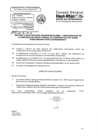 Dans le cadre du Fonds de soutien aux initiatives transfrontalières, il est proposé au Conseil Général de soutenir le projet d'organisation de 6 concerts de chant choral transfrontaliers par la chorale Cecilia's Swing de Wickerschwihr à hauteur de 1 300 € et l'édition 2015 du guide d'excursion pour l'Eurodistrict par l'association Regionalverband Südlicher Oberrhein pour un montant de 1 000 €