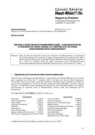 SOUTIEN A DEUX PROJETS TRANSFRONTALIERS - L'ORGANISATION DE 6 CONCERTS DE CHANT CHORAL ET L'EDITION 2015 DU GUIDE D'EXCURSIONS POUR L'EURODISTRICT