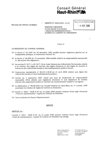 portant création d'une régie d'avances "Frais de représentation" auprès du cabinet du Président Resumé Pièces jointes ARRETE Assemblée : Non défini Date : 03/08/2006 Rapporteur : Non défini Collectivité : Conseil départemental du Haut-Rhin Direction : Non défini Service : Service Juridique Domaine : Organisation Interne Commission :