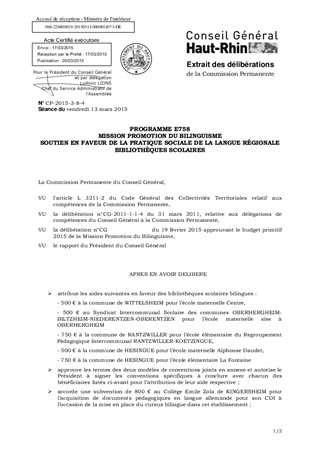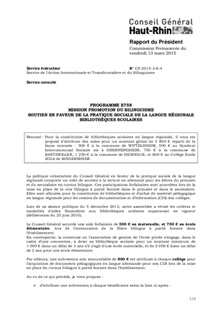 Pour la constitution de bibliothèques scolaires en langue régionale, il vous est proposé d’attribuer des aides pour un montant global de 3 800 € réparti de la façon suivante : 500 € à la commune de WITTELSHEIM, 500 € au Syndicat Intercommunal Scolaire sis à OBERHERGHEIM, 750 € à la commune de RANTZWILLER, 1 250 € à la commune de HESINGUE, et 800 € au Collège Emile ZOLA de KINGERSHEIM.