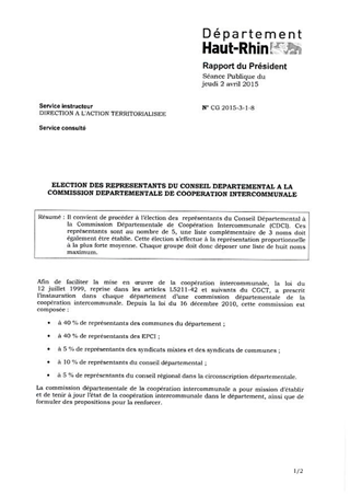 Il convient de procéder à l’élection des représentants du Conseil Départemental à la Commission Départementale de Coopération Intercommunale (CDCI). Ces représentants sont au nombre de 5, une liste complémentaire de 3 noms doit également être établie. Cette élection s’effectue à la représentation proportionnelle à la plus forte moyenne. Chaque groupe doit donc déposer une liste de huit noms maximum.