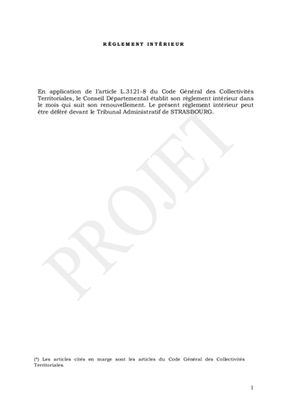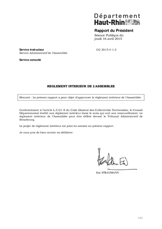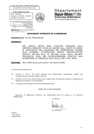 REGLEMENT INTERIEUR DE L'ASSEMBLEE Resumé Le présent rapport a pour objet d'approuver le règlement intérieur de l'Assemblée. Pièces jointes DELIBERATION RAPPORT ANNEXE Assemblée : Conseil Departemental Date : 16/04/2015 Rapporteur : Non défini Collectivité : Conseil départemental du Haut-Rhin Direction : Non défini Service : Service Administratif de l'Assemblée Domaine : Administration Commission : Assemblée Départementale
