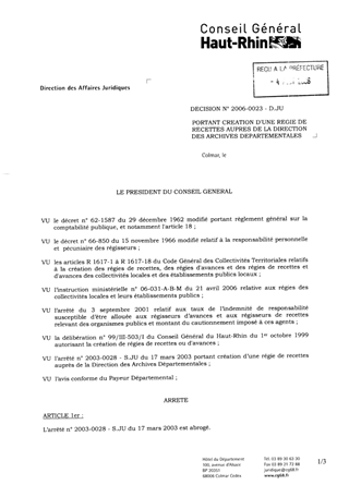 portant création d'une régie de recettes auprès de la Direction des Archives Départementales Resumé Pièces jointes ARRETE Assemblée : Non défini Date : 03/08/2006 Rapporteur : Non défini Collectivité : Conseil départemental du Haut-Rhin Direction : Non défini Service : Service Juridique Domaine : Organisation Interne Commission :