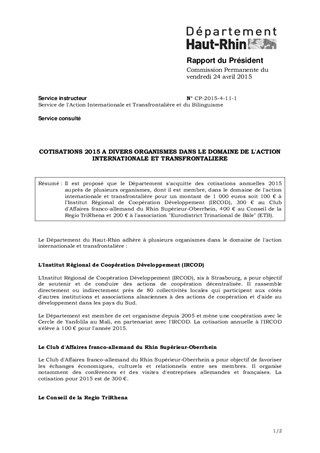 Il est proposé que le Département s'acquitte des cotisations annuelles 2015 auprès de plusieurs organismes, dont il est membre, dans le domaine de l'action internationale et transfrontalière pour un montant de 1 000 euros soit 100 € à l'Institut Régional de Coopération Développement (IRCOD), 300 € au Club d'Affaires franco-allemand du Rhin Supérieur-Oberrhein, 400 € au Conseil de la Regio TriRhena et 200 € à l'association "Eurodistrict Trinational de Bâle" (ETB).