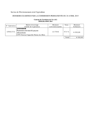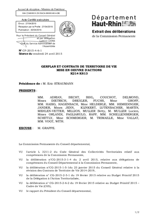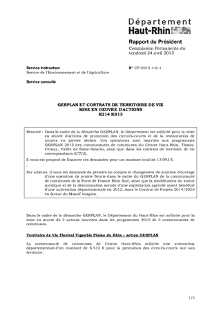 Dans le cadre de la démarche GERPLAN, le Département est sollicité pour la mise en œuvre d’actions de promotion des circuits-courts et de la restauration de murets en pierres sèches. Ces opérations sont inscrites aux programmes GERPLAN 2015 des communautés de communes du Centre Haut-Rhin, Thann-Cernay, Vallée de Saint-Amarin, ainsi que dans les contrats de territoire de vie correspondants (CTV2). Il vous est proposé de financer ces demandes pour un montant total de 13 093 €. Par ailleurs, il vous est demandé de prendre en compte le changement de maitrise d’ouvrage d’une opération de prairie fleurie dans le cadre du GERPLAN de la communauté de communes de la Porte de France Rhin Sud, ainsi que la modification du statut juridique et de la dénomination sociale d’une exploitation agricole ayant bénéficié d’une subvention départementale en 2012, dans le Contrat de Projets 2014/2020 en faveur du Massif Vosgien.