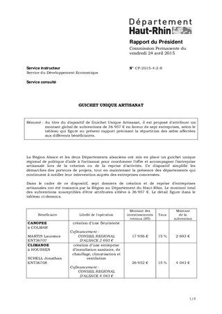 Au titre du dispositif de Guichet Unique Artisanat, il est proposé d'attribuer un montant global de subventions de 36 957 € en faveur de sept entreprises, selon le tableau qui figure au présent rapport précisant la répartition des aides affectées aux différents bénéficiaires.