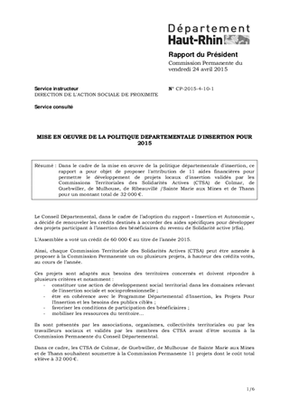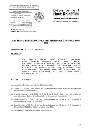 MISE EN OEUVRE DE LA POLITIQUE DEPARTEMENTALE D'INSERTION POUR 2015