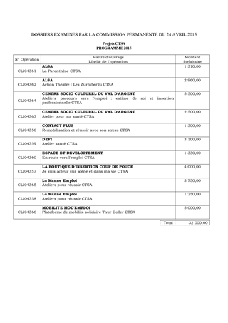Dans le cadre de la mise en œuvre de la politique départementale d'insertion, ce rapport a pour objet de proposer l'attribution de 11 aides financières pour permettre le développement de projets locaux d'insertion validés par les Commissions Territoriales des Solidarités Actives (CTSA) de Colmar, de Guebwiller, de Mulhouse, de Ribeauvillé /Sainte Marie aux Mines et de Thann pour un montant total de 32 000 €.
