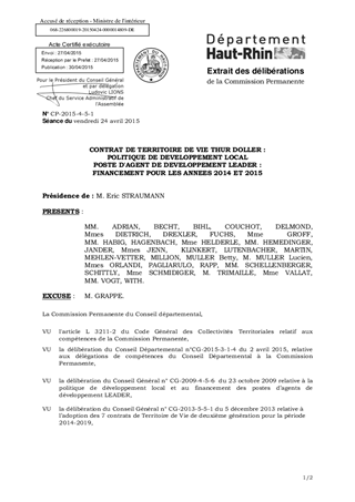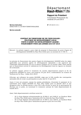 CONTRAT DE TERRITOIRE DE VIE THUR DOLLER : POLITIQUE DE DEVELOPPEMENT LOCAL POSTE D'AGENT DE DEVELOPPEMENT LEADER : FINANCEMENT POUR LES ANNEES 2014 ET 2015