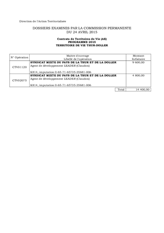 Le présent rapport a pour objet de proposer le financement du poste d’agent de développement LEADER du Pays Thur-Doller pour un montant de 14 400 €.
