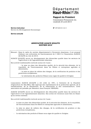 Dans le cadre du soutien départemental à l’économie alsacienne, il est proposé d’allouer une subvention de fonctionnement de 4 000 € à l’Association ALSACE QUALITE au titre de 2015. ALSACE QUALITE œuvre au développement des démarches qualité dans les secteurs de l'agriculture et de l'agroalimentaire alsaciens. Son activité traditionnelle s'articule autour de 3 axes : - la mise en place des démarches qualité, de la sécurité des aliments, de la traçabilité, de l’environnement dans les filières et entreprises agricoles et alimentaires, - la mise en place de cahiers des charges, de la certification de produits et des protections européennes, - la valorisation des produits d’Alsace sous signe de qualité et d’origine.