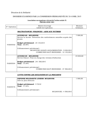 Il vous est soumis, dans le présent rapport les demandes de subventions de fonctionnement des Associations relevant des différents services de la Solidarité pour un montant de 393 130 €. Dans le domaine de l’aide aux victimes et/ou maltraitances et violences, 2 subventions sont proposées en faveur de l'association Accord 68 pour un montant de 42 000 €. Dans le domaine de la lutte contre l’exclusion, 1 subvention est proposée pour un montant de 1 000 €. Dans le domaine de l’aide alimentaire et des épiceries sociales, 1 subvention est proposée pour un montant de 9 000 €. Dans le domaine de l’aide aux personnes handicapées, 1 subvention est proposée pour un montant de 1 500 €. Dans le domaine de l’aide aux personnes âgées, 5 subventions sont proposées en faveur de 3 associations pour un montant de 176 630 € dont • 124 830 € en faveur d’Apalib pour ses diverses actions • 41 800 € en faveur d’Apamad pour son service de portage de repas Dans le domaine de la protection de l’enfance, 1 subvention est proposée en faveur de la Petite Ourse pour son espace rencontre parents- enfants pour un montant de 20 000 € Dans le domaine de la promotion de la santé, 5 subventions sont proposées en faveur de 5 associations pour un montant de 143 000 € dont : • 20 000 € en faveur d’Arer 68 pour ses actions relatives au recensement des nouveaux cas de cancer • 90 000 € en faveur d’Adeca pour ses actions relatives au dépistage du cancer colo-rectal • 20 000 € en faveur de l’Ufsbd 68 pour ses actions relatives à l’éducation de l’hygiène bucco dentaire des enfants dans les écoles maternelles