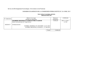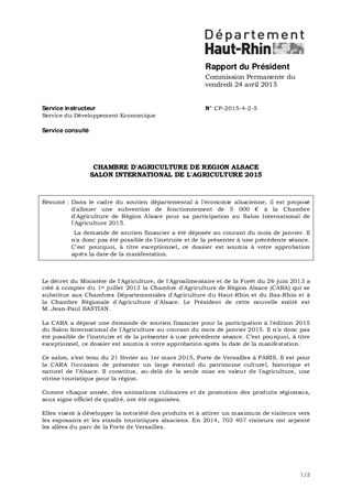 Dans le cadre du soutien départemental à l'économie alsacienne, il est proposé d'allouer une subvention de fonctionnement de 5 000 € à la Chambre d'Agriculture de Région Alsace pour sa participation au Salon International de l'Agriculture 2015. La demande de soutien financier a été déposée au courant du mois de janvier. Il n'a donc pas été possible de l'instruire et de la présenter à une précédente séance. C'est pourquoi, à titre exceptionnel, ce dossier est soumis à votre approbation après la date de la manifestation.