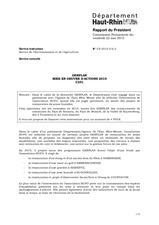Dans le cadre de la démarche GERPLAN, le Département s’est engagé dans un partenariat avec l’Agence de l’Eau Rhin Meuse afin de solliciter l’intervention de l’association BUFO, quand elle est jugée pertinente, en amont des projets de restauration de zones humides. Cinq opérations ont été recensées en 2015, issues des GERPLAN des communautés de communes du Pays de Sierentz, du Pays de Brisach, de la Vallée de Kaysersberg, des 3 Frontières et du Jura alsacien. Il vous est proposé de financer cette intervention pour un montant de 4 950 €.