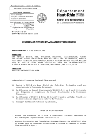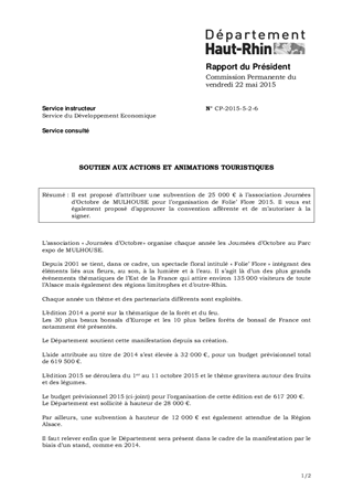 Il est proposé d’attribuer une subvention de 25 000 € à l’association Journées d’Octobre de MULHOUSE pour l’organisation de Folie’ Flore 2015. Il vous est également proposé d’approuver la convention afférente et de m’autoriser à la signer.