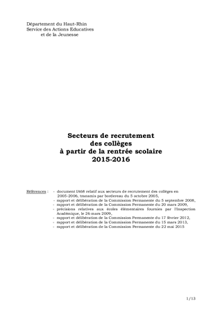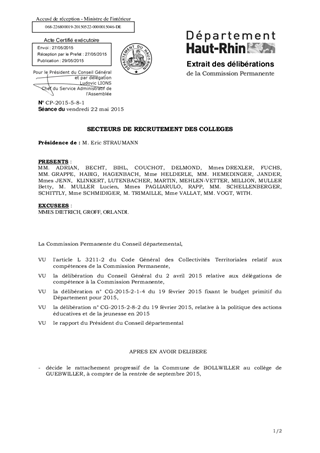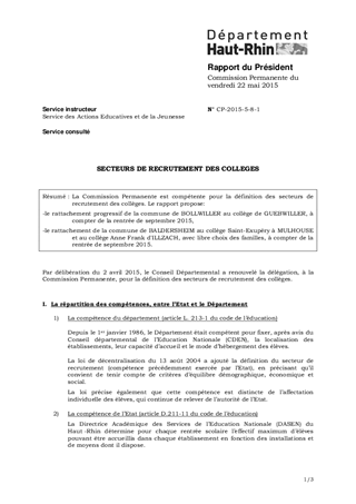 La Commission Permanente est compétente pour la définition des secteurs de recrutement des collèges. Le rapport propose: -le rattachement progressif de la commune de BOLLWILLER au collège de GUEBWILLER, à compter de la rentrée de septembre 2015, -le rattachement de la commune de BALDERSHEIM au collège Saint-Exupéry à MULHOUSE et au collège Anne Frank d'ILLZACH, avec libre choix des familles, à compter de la rentrée de septembre 2015.