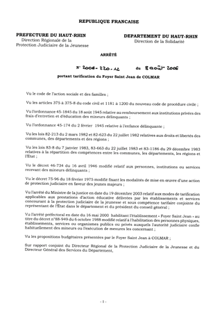 portant tarification du Foyer Saint Jean de Colmar Resumé Pièces jointes ARRETE Assemblée : Non défini Date : 08/08/2006 Rapporteur : Non défini Collectivité : Conseil départemental du Haut-Rhin Direction : Non défini Service : Direction de la Solidarité Domaine : Autres (non classés) Commission :