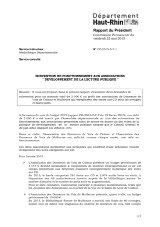 Il vous est proposé, dans le présent rapport, d'examiner deux demandes de subvention pour un montant total de 2 000 € au profit des associations de Donneurs de Voix de Colmar et Mulhouse qui enregistrent des textes sur CD pour les aveugles et malvoyants.