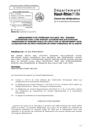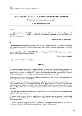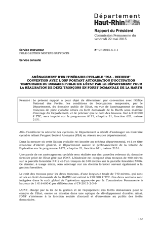 AMÉNAGEMENT D'UN ITINÉRAIRE CYCLABLE "PSA - RIXHEIM" CONVENTION AVEC L'ONF PORTANT AUTORISATION D'OCCUPATION TEMPORAIRE DU DOMAINE PUBLIC DE L'ÉTAT PAR LE DÉPARTEMENT POUR LA RÉALISATION DE DEUX TRONÇONS EN FORET DOMANIALE DE LA HARTH