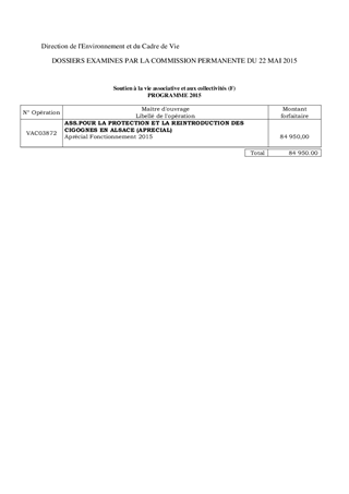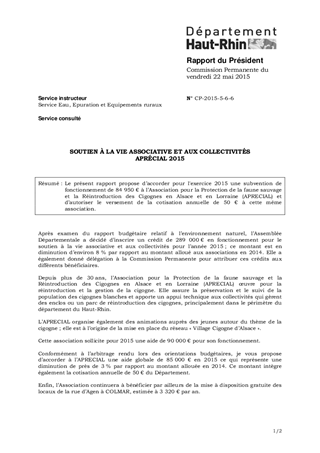 Le présent rapport propose d’accorder pour l'exercice 2015 une subvention de fonctionnement de 84 950 € à l’Association pour la Protection de la faune sauvage et la Réintroduction des Cigognes en Alsace et en Lorraine (APRECIAL) et d’autoriser le versement de la cotisation annuelle de 50 € à cette même association.