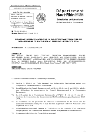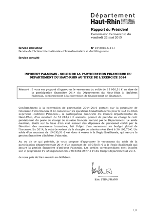 INFOBEST PALMRAIN - SOLDE DE LA PARTICIPATION FINANCIERE DU DEPARTEMENT DU HAUT-RHIN AU TITRE DE L'EXERCICE 2014
