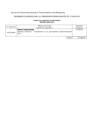 Il vous est proposé d’approuver le versement du solde de 15 050,51 € au titre de la participation financière 2014 du Département du Haut-Rhin à l’Infobest Palmrain, conformément à la convention de financement de l’instance.
