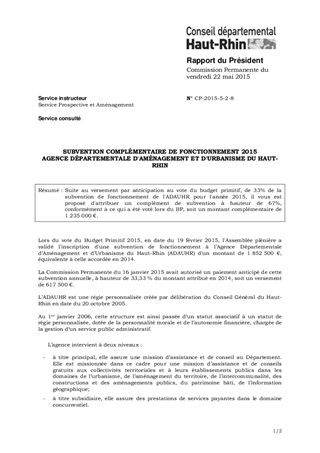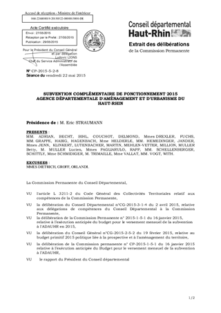 SUBVENTION COMPLÉMENTAIRE DE FONCTIONNEMENT 2015 AGENCE DÉPARTEMENTALE D'AMÉNAGEMENT ET D'URBANISME DU HAUT-RHIN