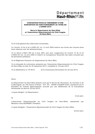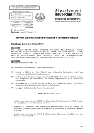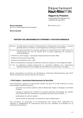 Le Département soutient le fonctionnement d’organismes de tourisme à vocation générale afin de contribuer au développement touristique du Haut-Rhin. Il vous est proposé d’accorder un montant maximum de subvention de 61 800 €, pour leur fonctionnement au titre de l’année 2015, à quatre organismes de tourisme à vocation générale : - 36 000 € au Club Vosgien – Association Départementale du Haut-Rhin - 20 000 € à Clévacances Haut-Rhin - 5 000 € à la Coopérative AJA – UES - 800 € à la Fédération Française des Stations Vertes de Vacances et des Villages de Neige. Il vous est également proposé d'approuver la convention afférente avec l'Association Départementale du Club Vosgien du Haut-Rhin et de m'autoriser à la signer.